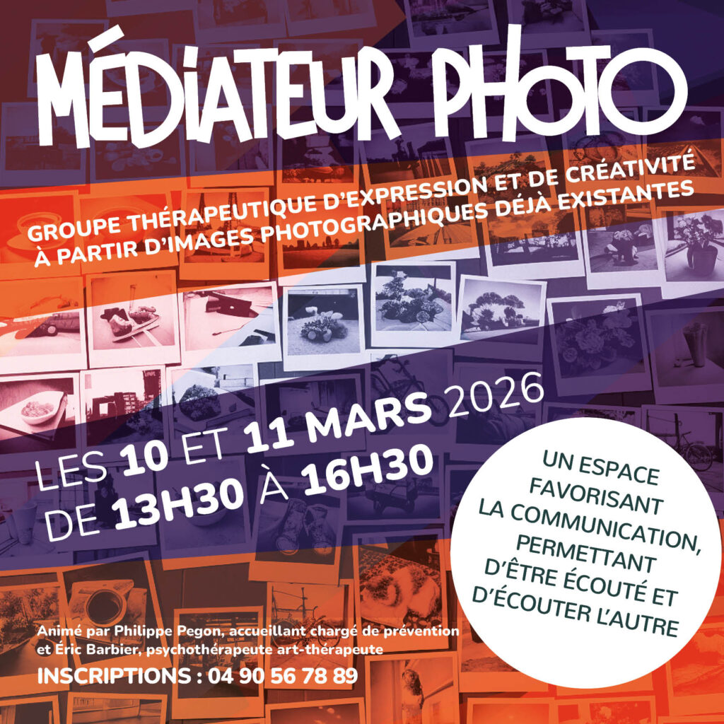 Groupe thérapeutique d’expression et de créativité à partir d’images photographiques déjà existantes. Un espace favorisant la communication, permettant d’être écouté et d’écouter l’autre. Les 10 et 11 mars 2026 de 13h30 à 16h30 À la MDA 13Nord de Salon-de-Provence INSCRIPTIONS : 04 90 56 78 89
